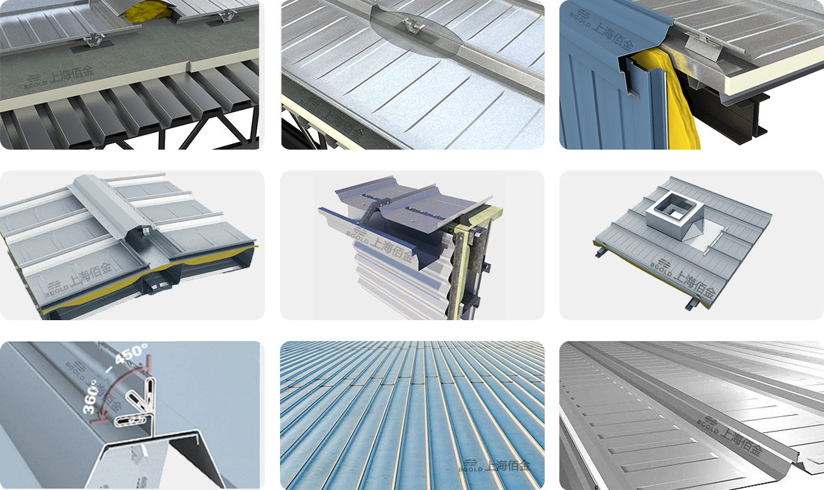 360°直立縫屋面系統(tǒng),連接處涂密封膠,屋面板連接采用360度雙鎖卷邊技術(shù),實(shí)現(xiàn)極佳的水密、氣密性以及優(yōu)異的抗風(fēng)雨性能。